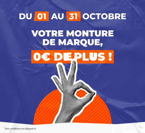 Pour tout achat d’un équipement optique complet (monture + verres correcteurs adaptés à votre prescription), sélectionnez une monture de marque parmi une sélection dédiée, sans supplément de prix. L’offre s’applique uniquement sur toutes les montures de marques hors collections premium/sélectives signalées en magasin, dans la limite des stocks disponibles. Dans la limite d’une remise maximale de 80€. Les verres correcteurs doivent correspondre à une correction prise en charge par l’Assurance Maladie.